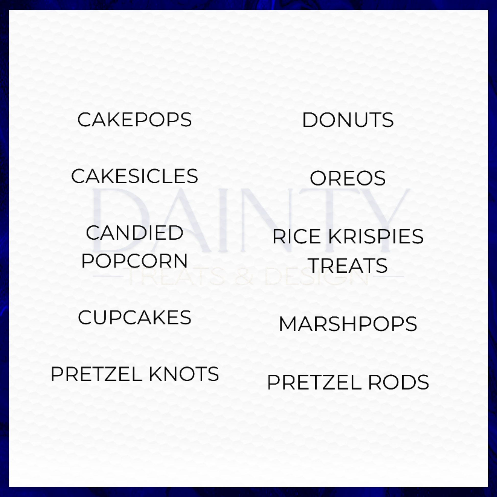 DAINTY TREATS & DESIGN MAY CONTAIN OR COME IN CONTACT WITH MILK, WHEAT, NUTS OR OTHER ALLERGENS. IT IS THE RESPONSIBILITY OF THE CLIENT TO INFORM HIS/HER GUESTS OF THIS FACT. DAINTY TREATS & DESIGN IS NOT RESPONSIBLE & WILL NOT BE HELD LIABLE FOR ANY ALLERGIC REACTIONS OR INJURIES SUSTAINED AS A RESULT OF CONSUMPTION.